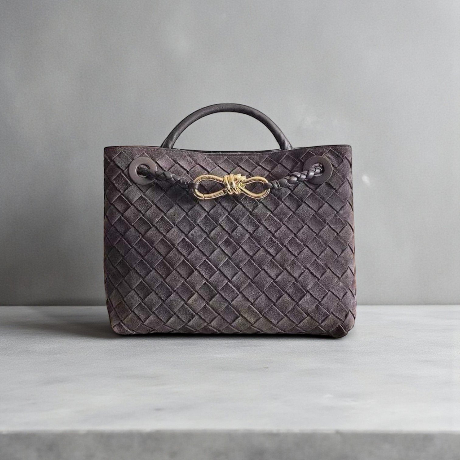 Materials  Top handle bag in supple intrecciato suede with