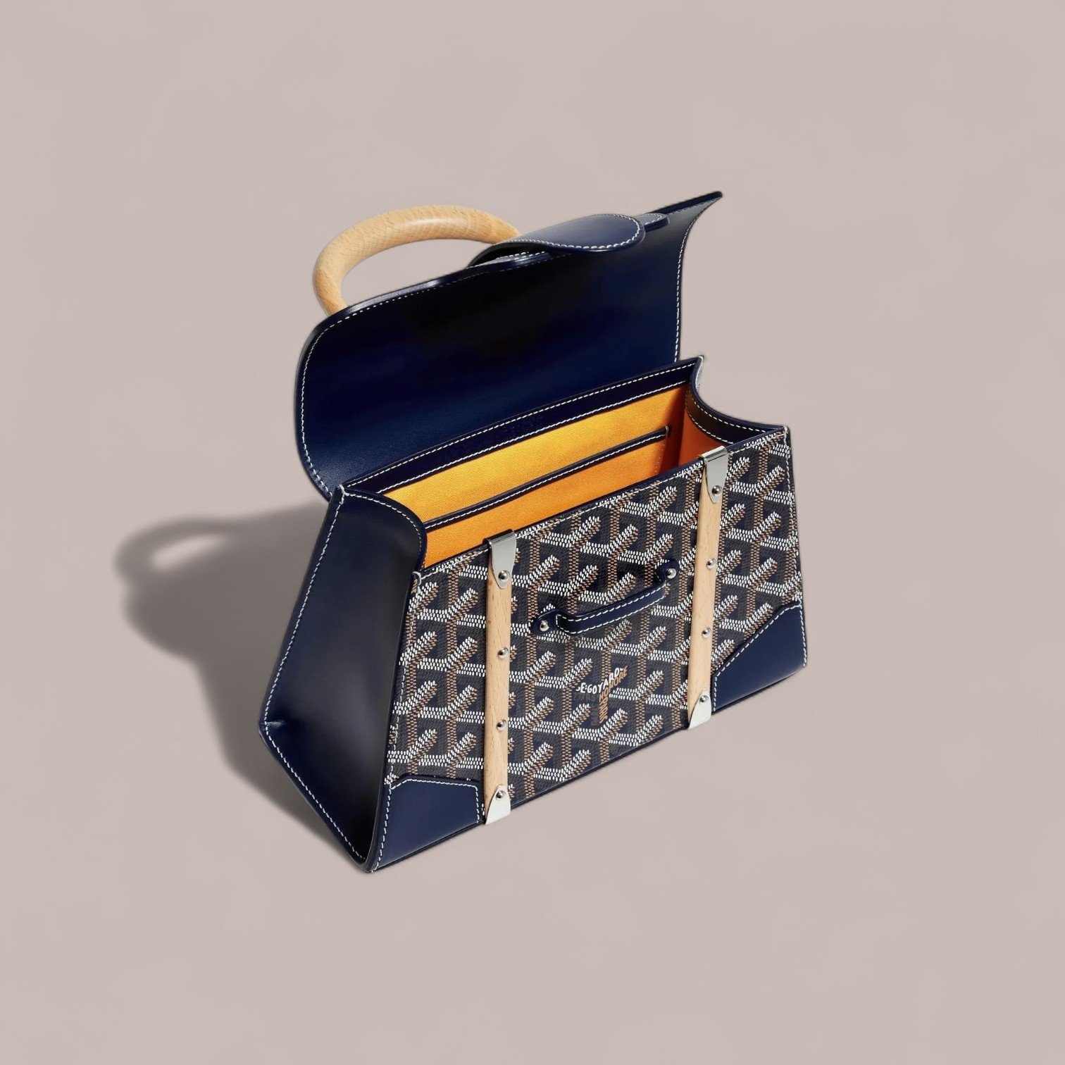 Materials Goyardine Canvas & Cervon Calfskin, Yellow Cotton Lining Leather strap and loop fastening system Size L 20 cm x W 7.5 cm x H 15 cm Color Navy Blue