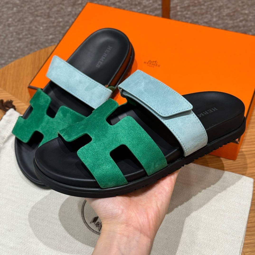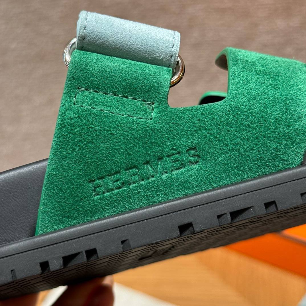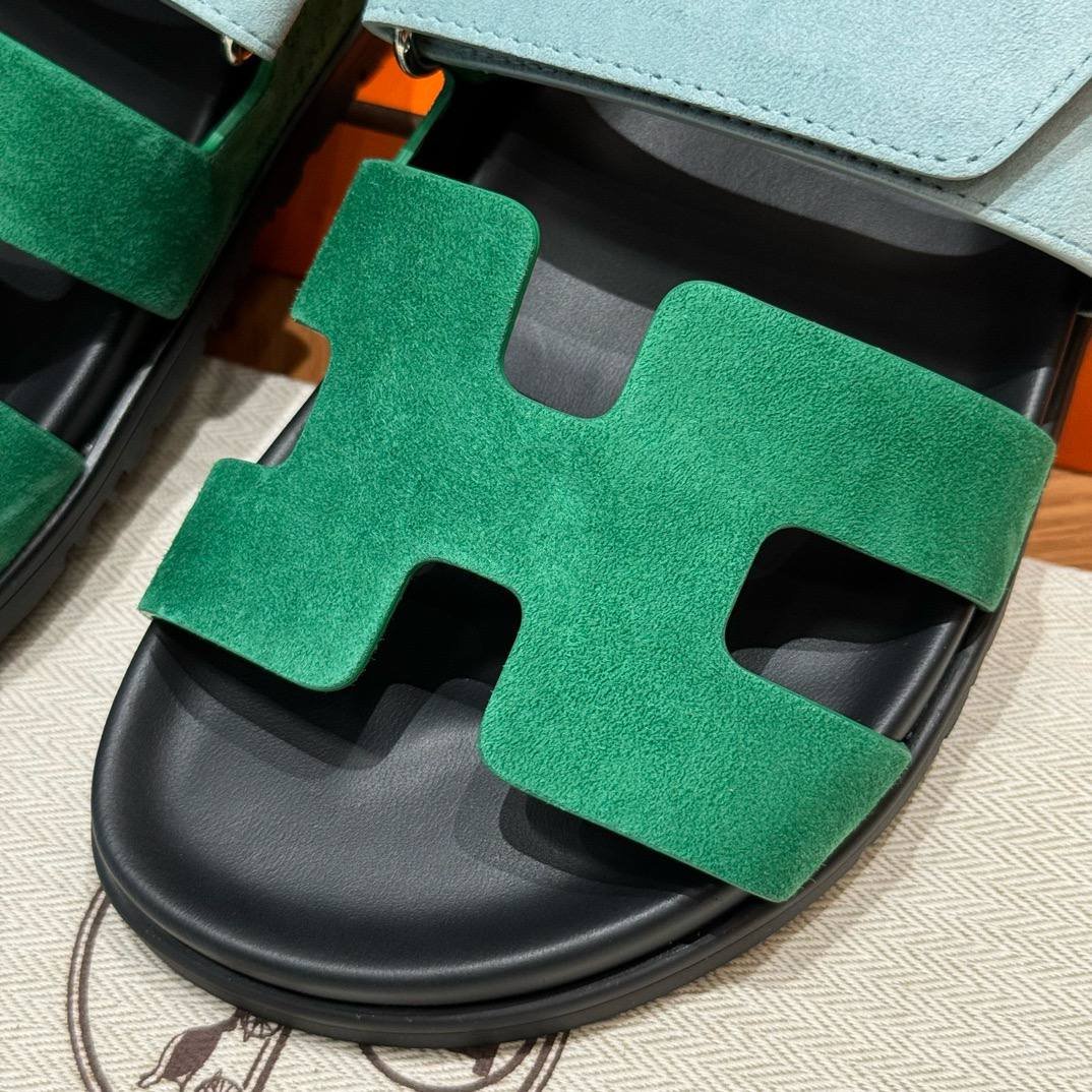 Hermes Chypre Sandals in Green/Light Blue, Chamois Leather