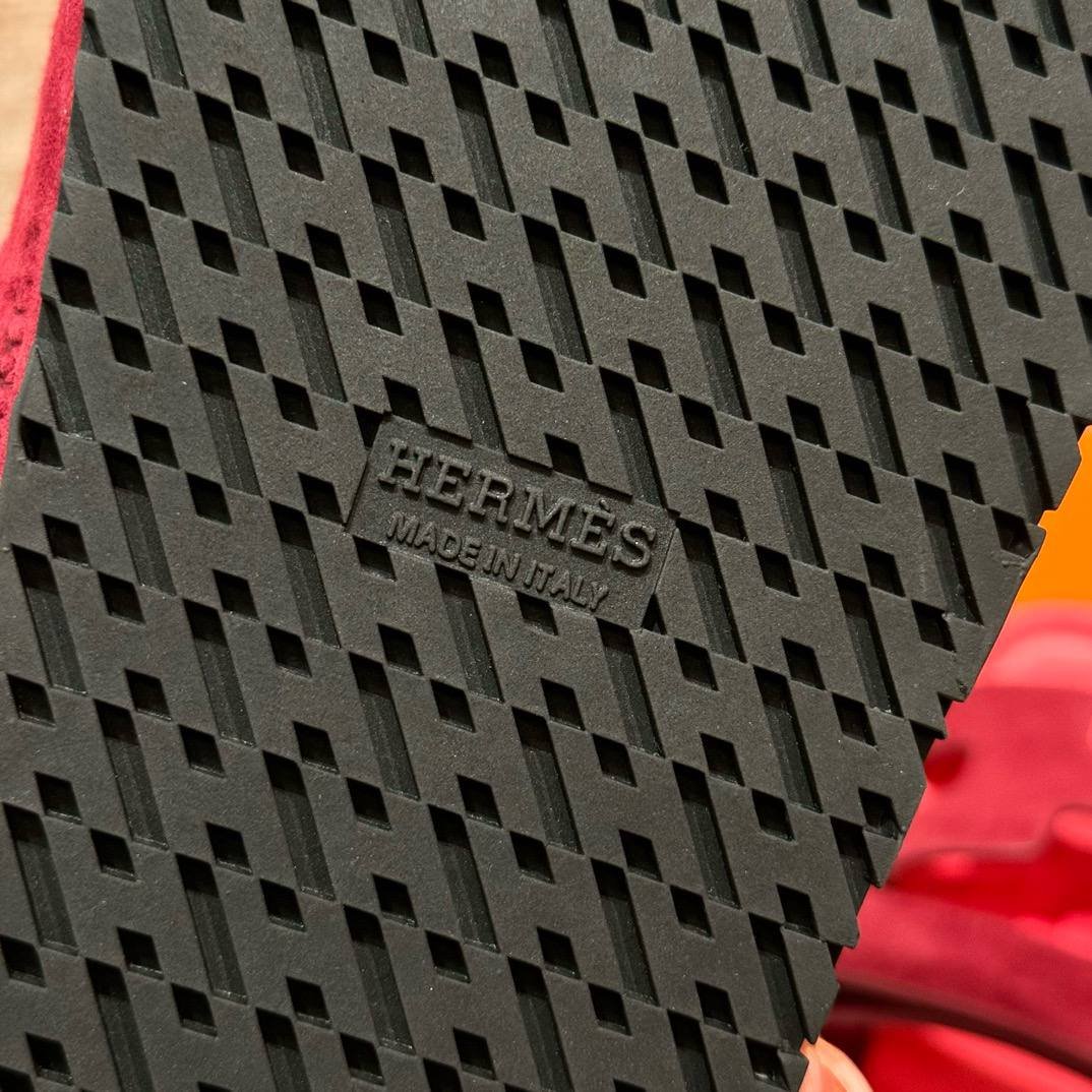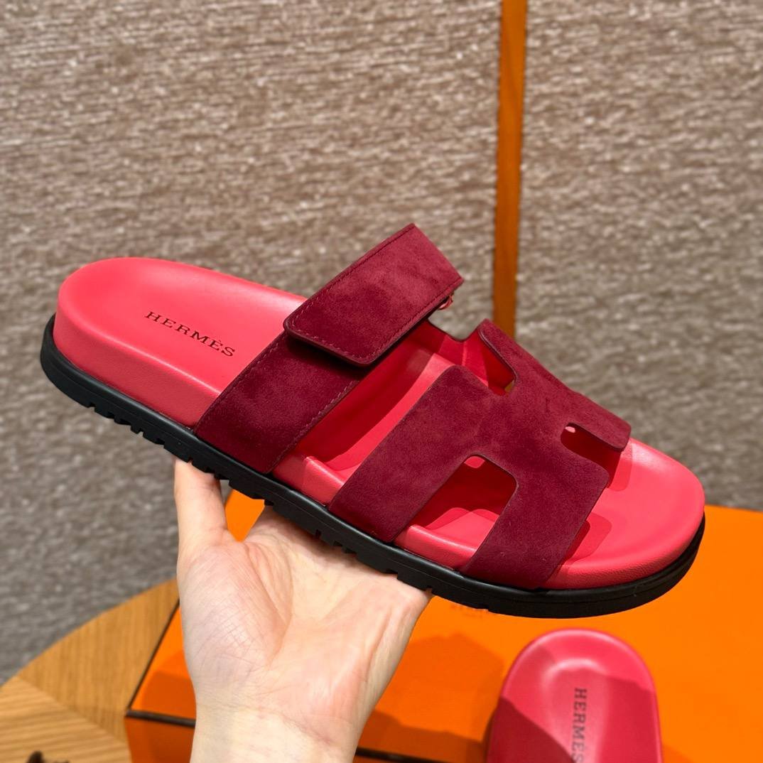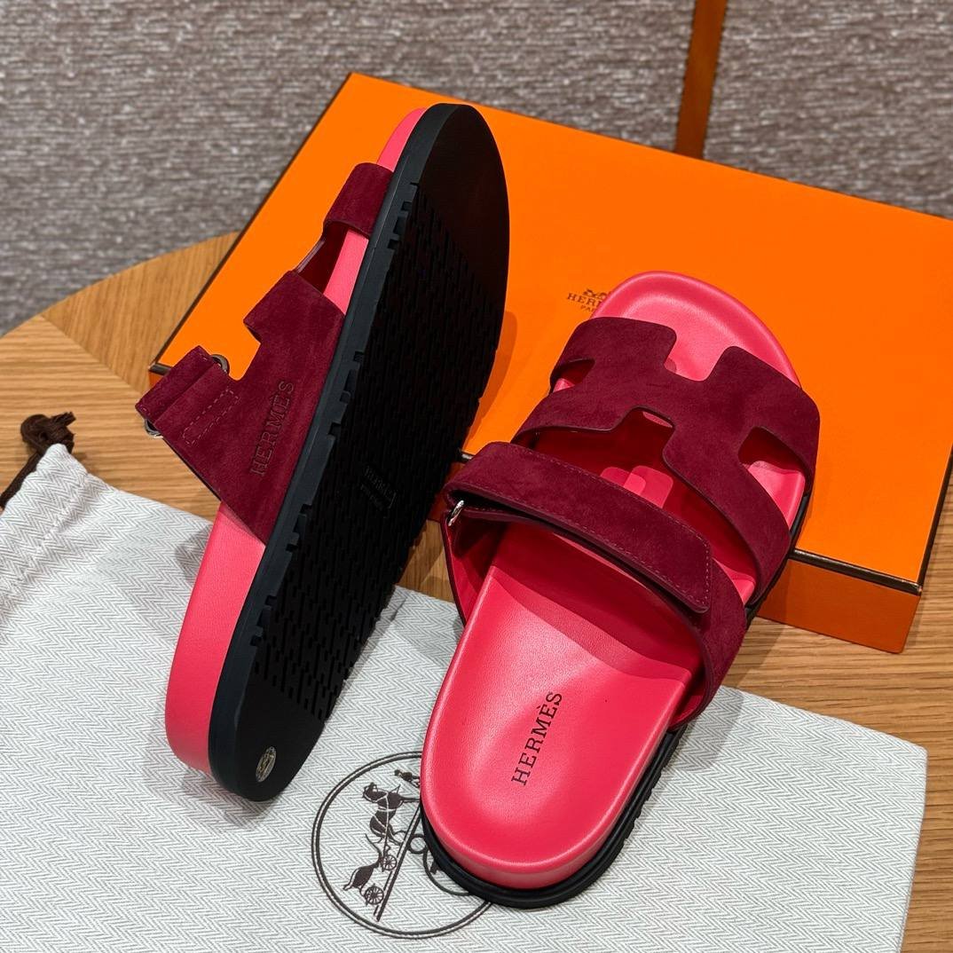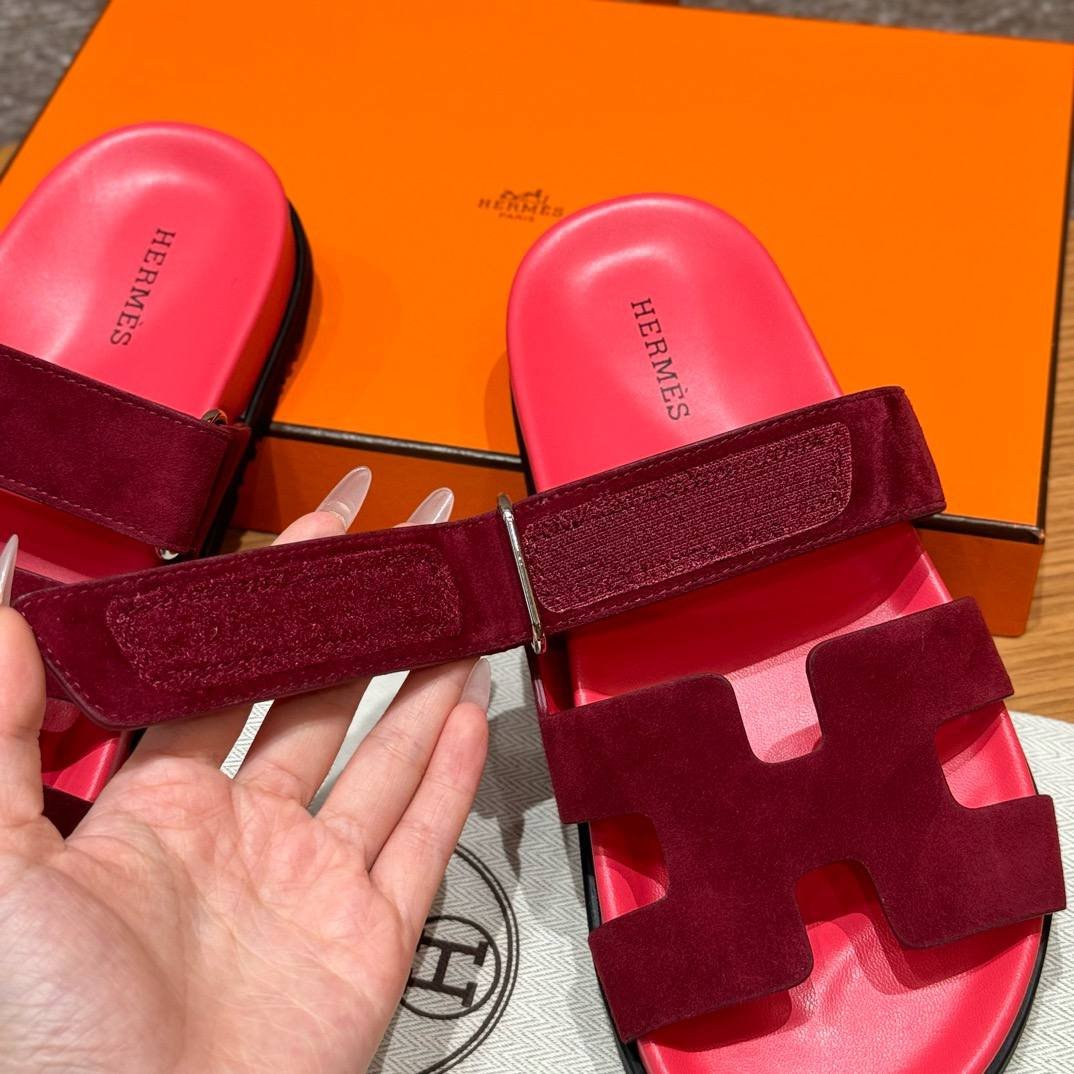 Hermes Chypre Sandals in Rose Red, Chamois Leather