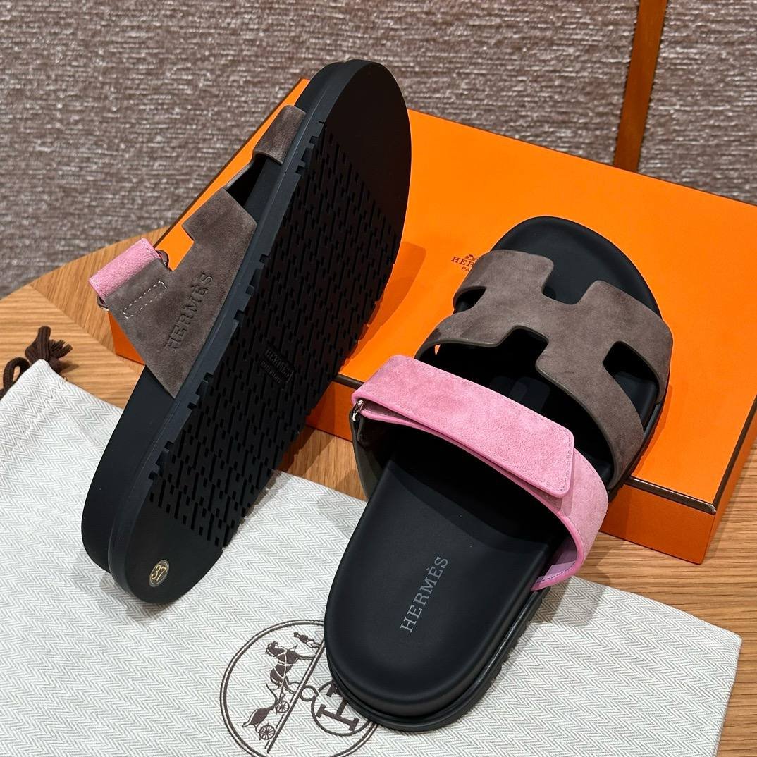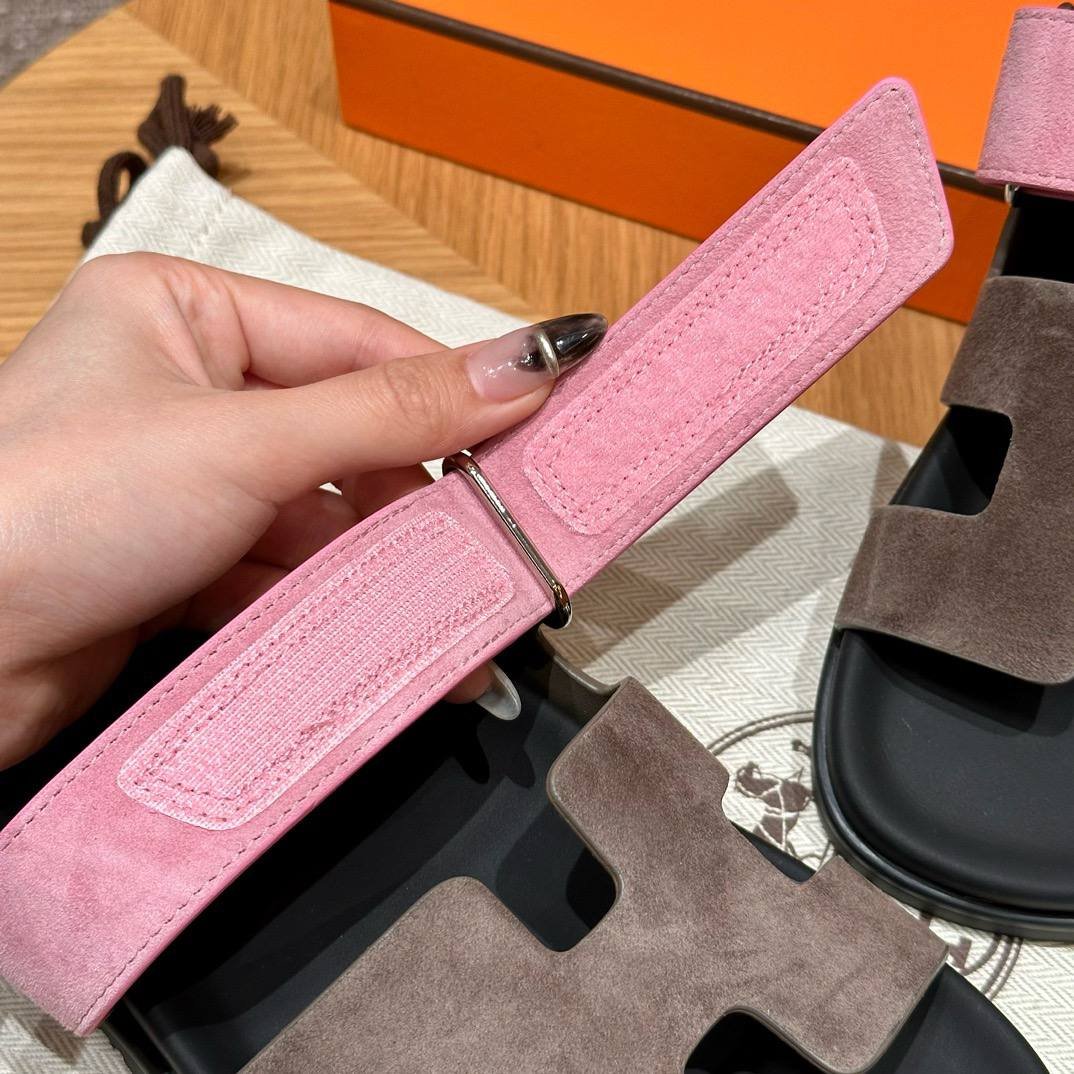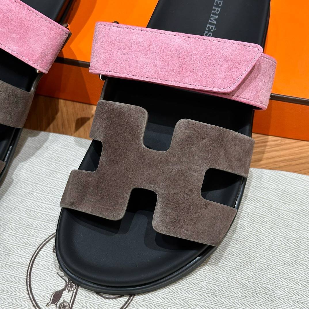 Hermes Chypre Sandals in Vert Toundra & Pink, Chamois Leather