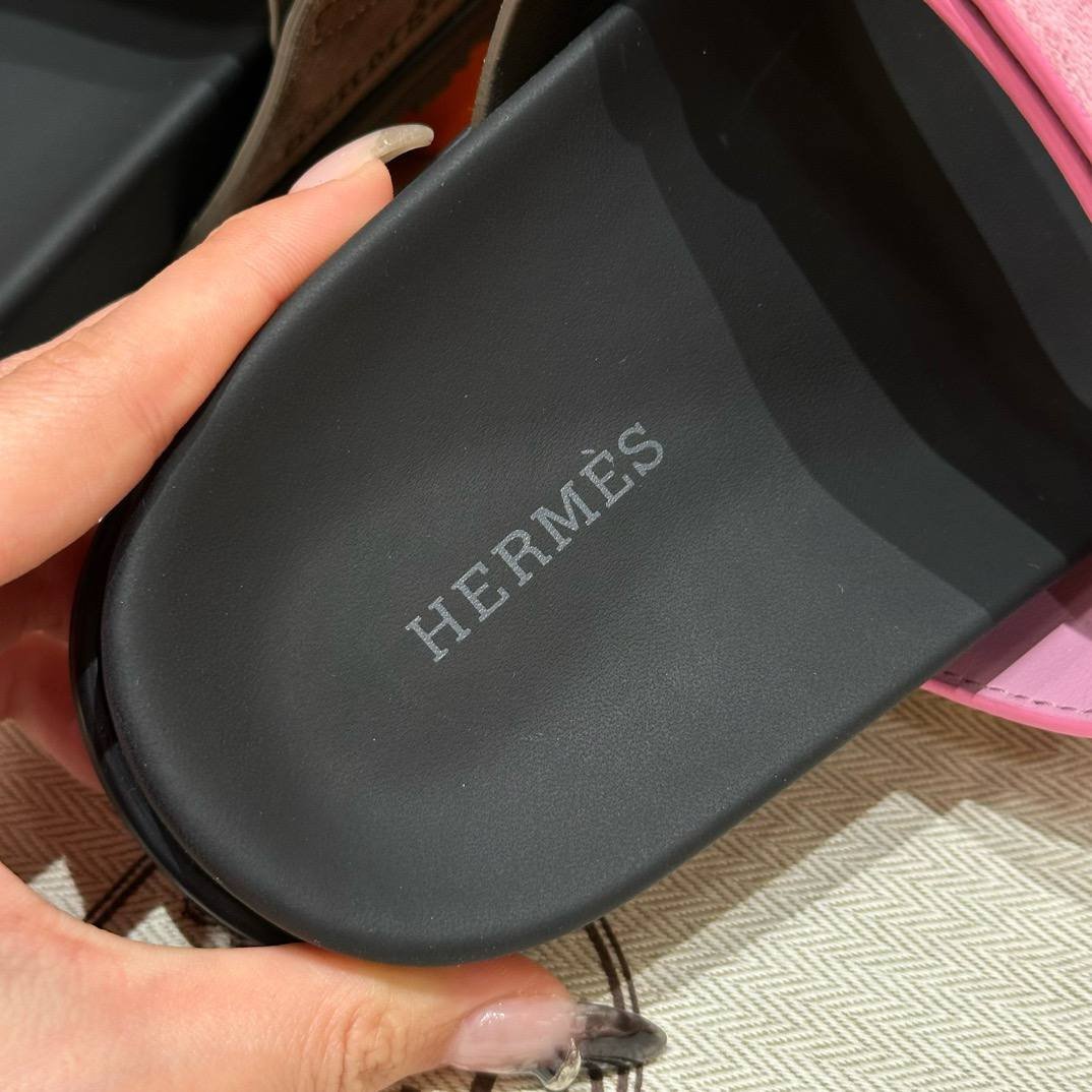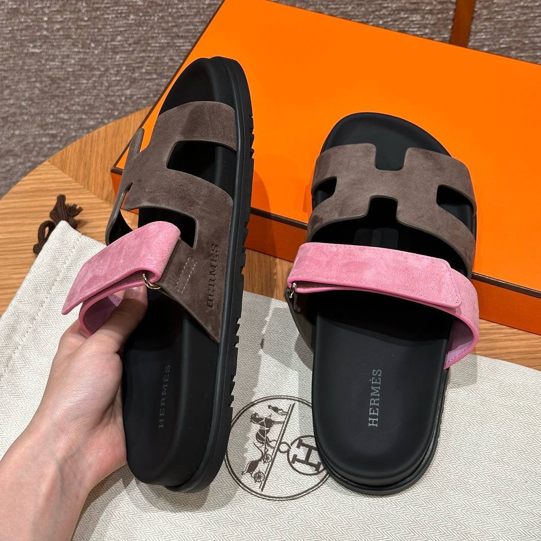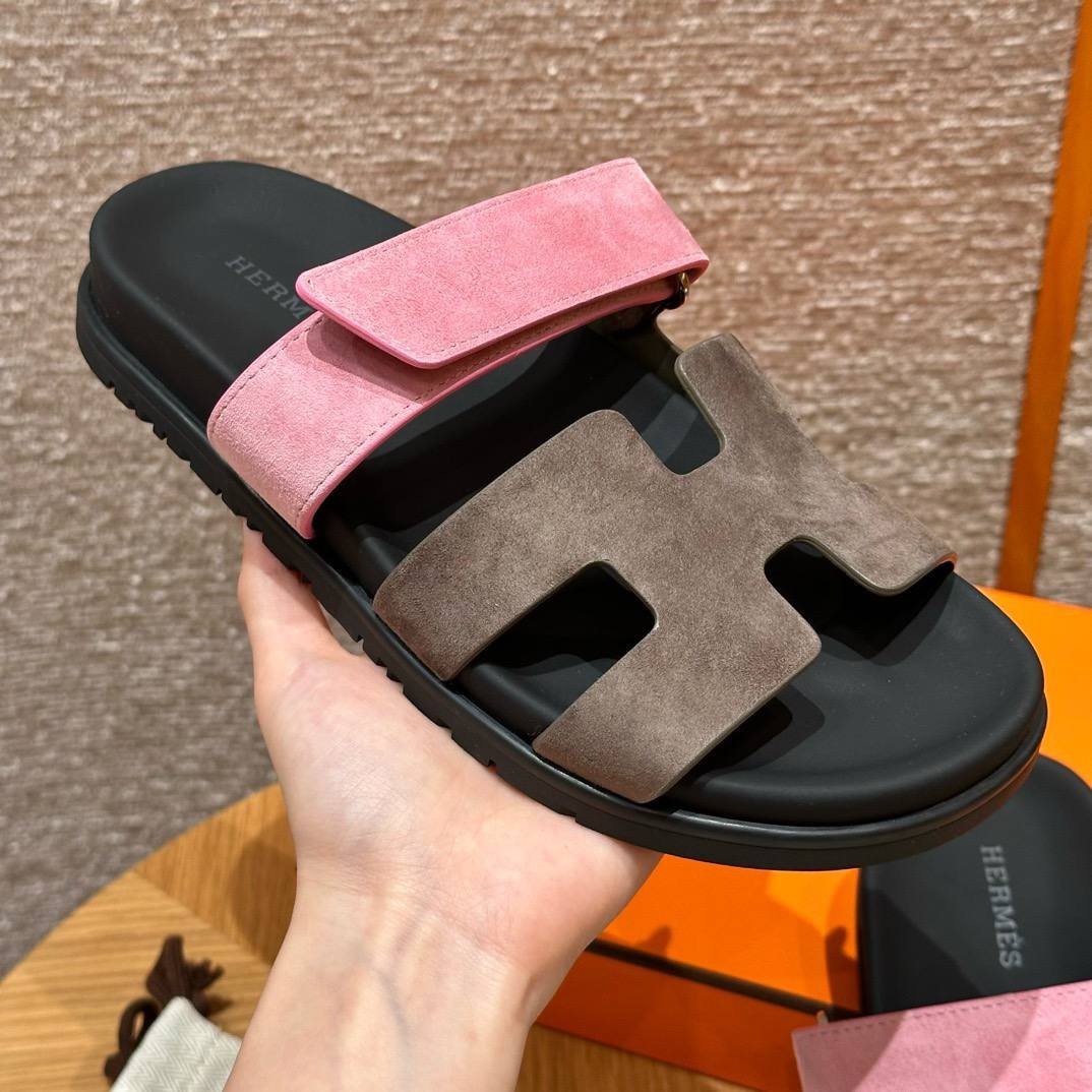 Hermes Chypre Sandals in Vert Toundra & Pink, Chamois Leather